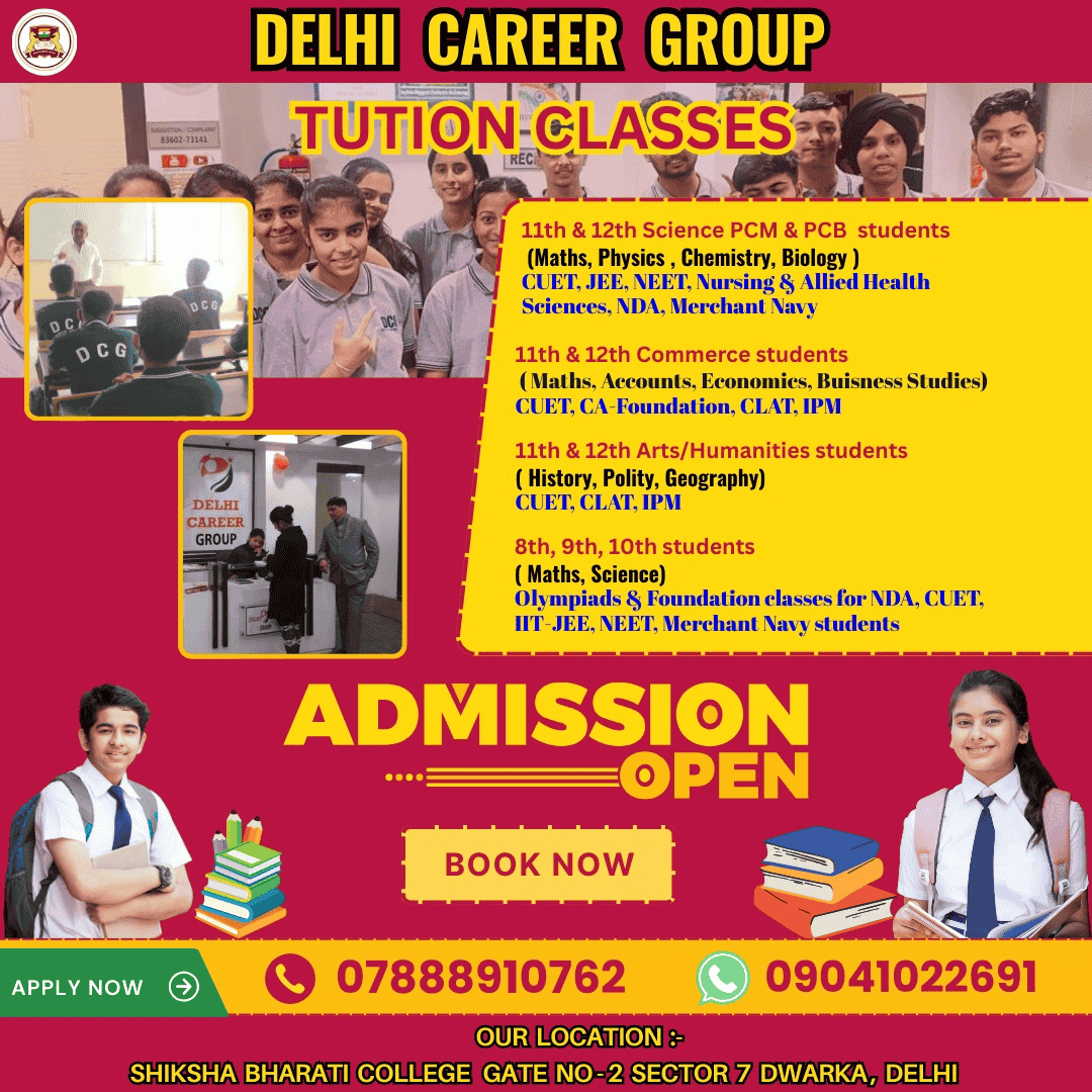 Delhi Career Group stands as the premier destination for Best Tution Classes coaching in Delhi Dwarka, We have established ourselves as the leading Tution Classes coaching academy in India, consistently delivering exceptional results and transforming students into successful various exams.Our Tution CLasses exam preparation in India follows a meticulously structured approach that covers all essential aspects of the examination.